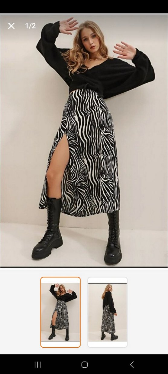 Siyah beyaz zebra desenli, kürk detaylı uzun midi etek. Sentetik kumaştan, bol kesim ve sokak stiline uygun.