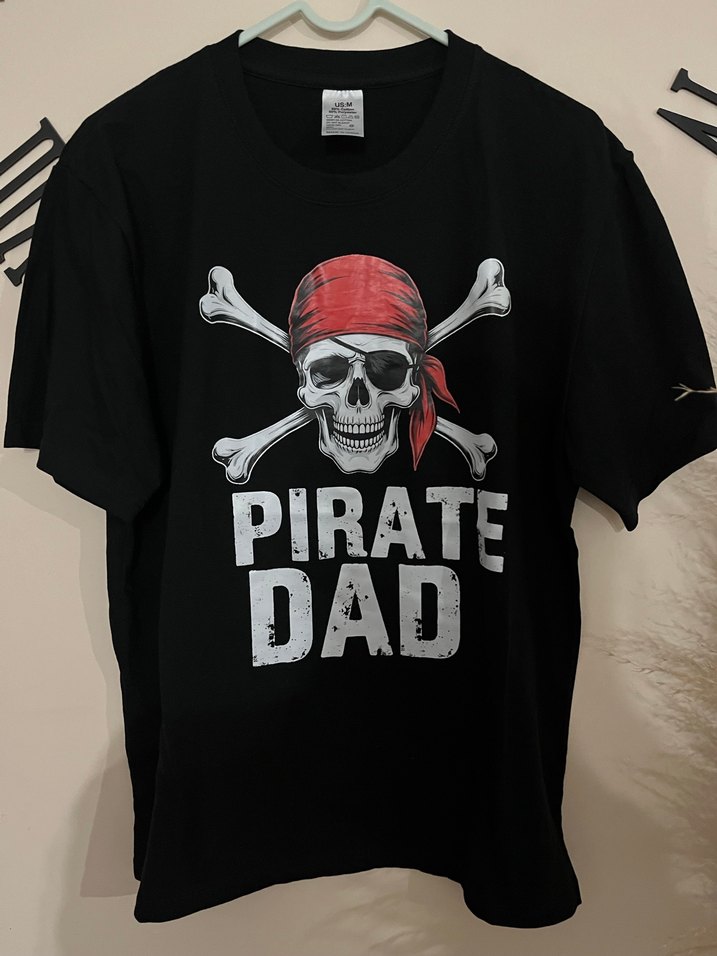 Oğlumun dogum gününde bir kere giyildi Siyah, kısa kollu, bisiklet yaka, bol kesim baskılı erkek tişörtünde korsan kafatası ve 'PIRATE DAD' yazısı yer alır. ☠️