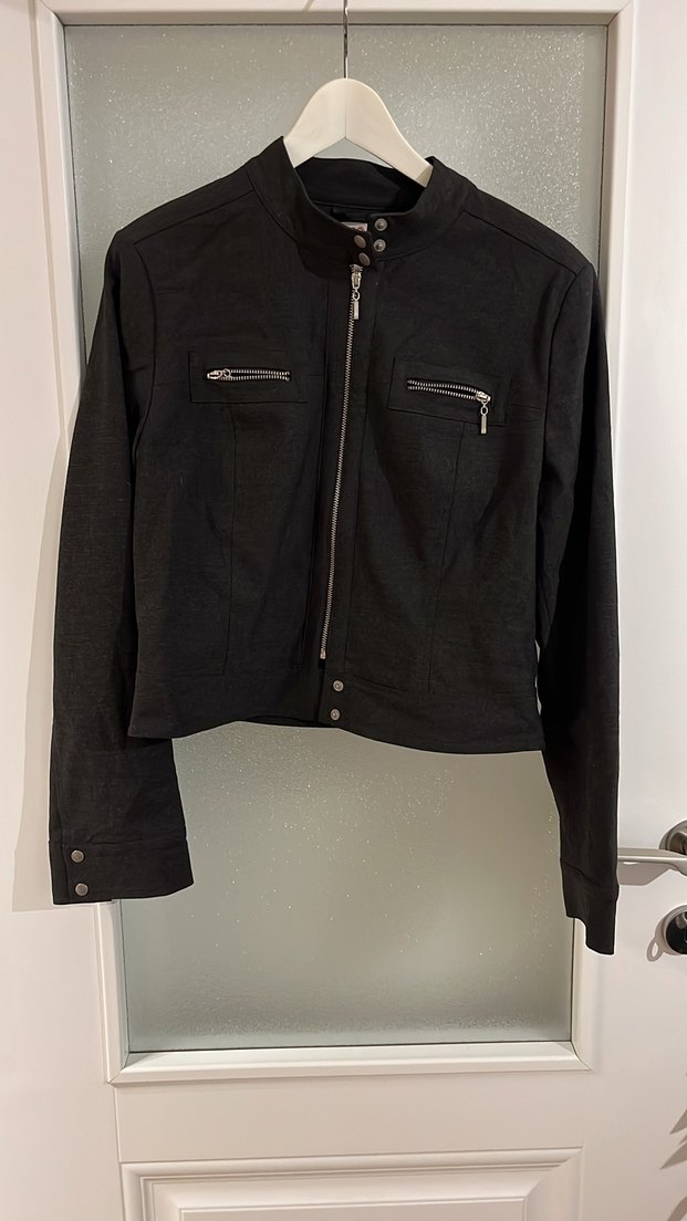 Bu siyah biker ceket, uzun kollu ve oturaklı kesime sahiptir. Fermuarlı cepler ve ön fermuar kapanışı bulunur, günlük kullanıma uygundur.