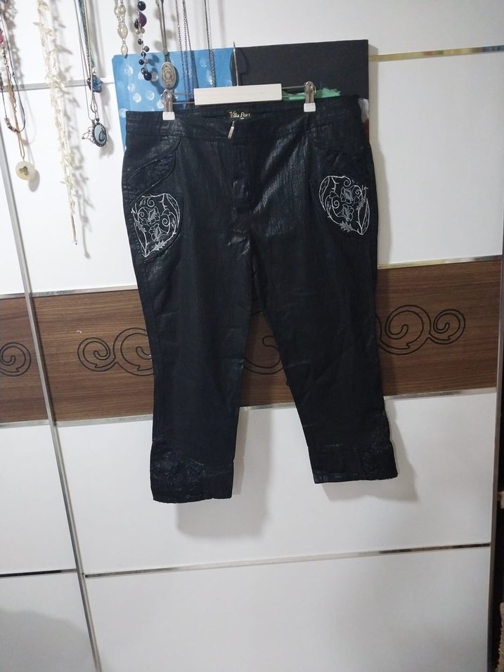 Siyah biker tarzı denim pantolon, bol kesim ve midi boyda, tokalı detaylar ve nakışlı ceplerle günlük şıklık sunar.