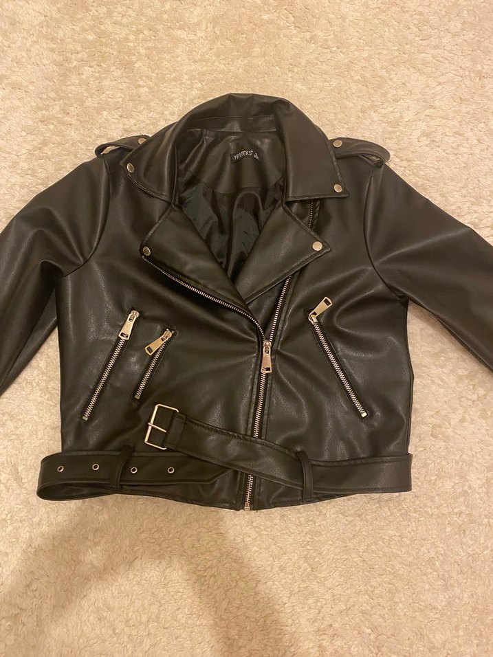 Kemerli , fermuarlı cepler ve keskin yakasıyla, siyah dar kesim biker deri ceket. S beden