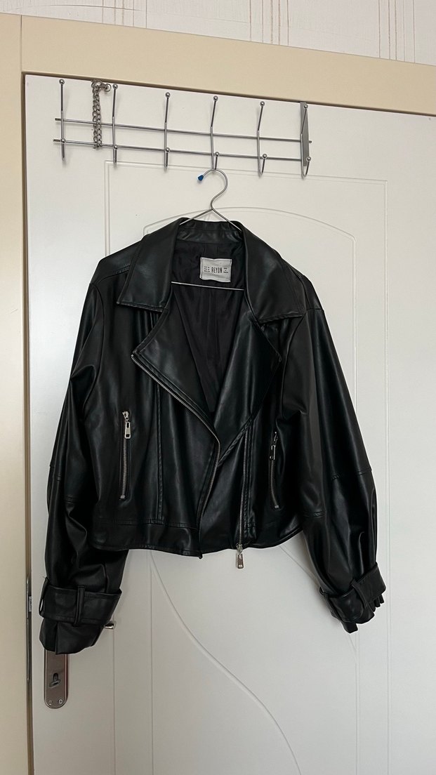 Siyah deri, fitted kesim, kemerli ve yakalı biker ceket. Askılı kollar ve normal boy ile günlük kullanıma uygun.