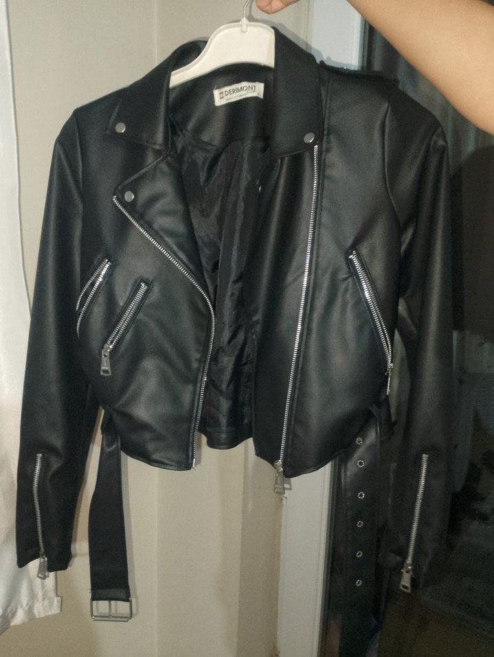 Siyah biker deri ceket, fitted kesim, çıtçıtlı yaka, fermuarlı detaylar ve kayışlı kollarla grunge punk tarzını yansıtır. Günlük kullanım için uygundur. aynı zamanda fermuarı biraz zor kapanır