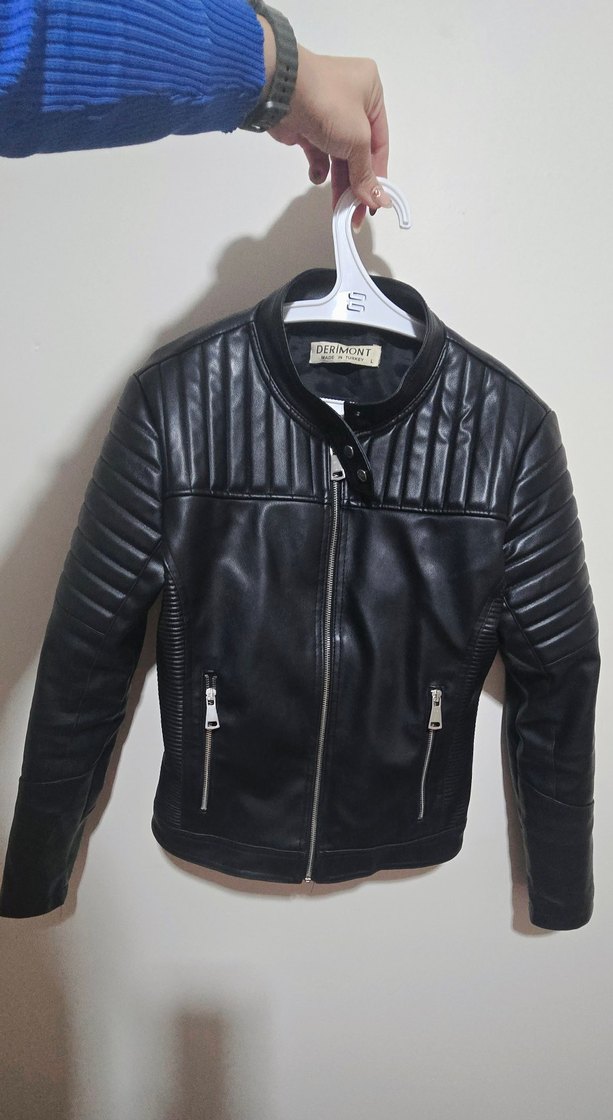 Fermuarlı, dar kesim, siyah biker deri kadın ceket, yuvarlak yaka, iç astarları da sağlam deformasyon yok. 160-60 kg tam oluyor. L beden ama dar kesim. boy kg dikkate alarak alım yapınız.