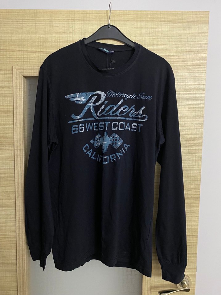 Siyah renk, bol kesim erkek sweatshirt, uzun kollu ve bisiklet yakalıdır. Denim görünümlü kumaş, baskılı biker deseni ve zincir detayı içerir. ️