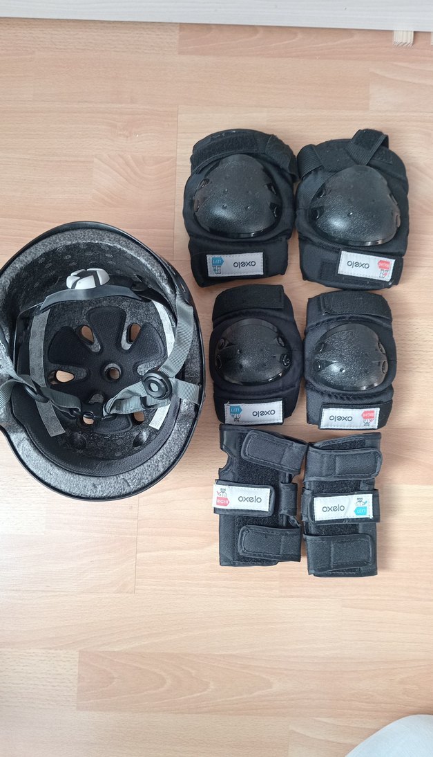 Siyah biker tarzı diz koruyucular ve bilek destekleri, plastik koruma ve cırt cırtlı bantlarla sağlam tutuş sağlar. Athleisure aktiviteleri için uygundur. ️