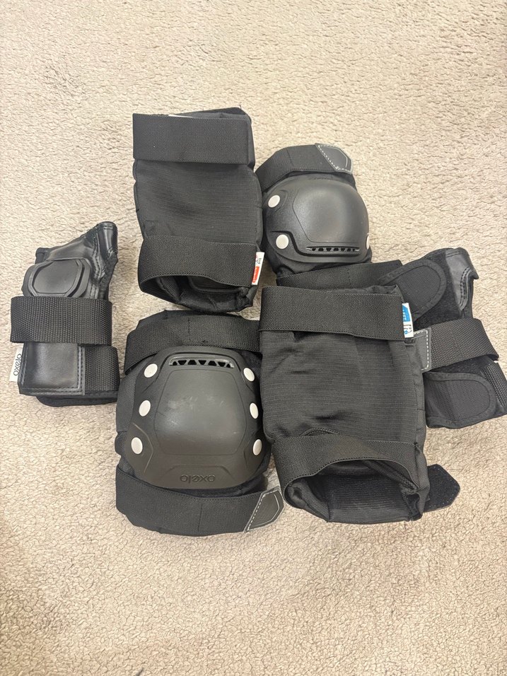 OXELO marka destek seti koruyucu seti paten scooter kaykay bisiklet her şeyde kullanılabilir. Hem yetişkinlere hem çocuklara uygun. Velcro kayışlı, yumuşak kürk iç yüzeyli siyah biker tarzı diz koruyucular. Aktif kullanıma uygun, desen içermeyen şık tasarım. ️