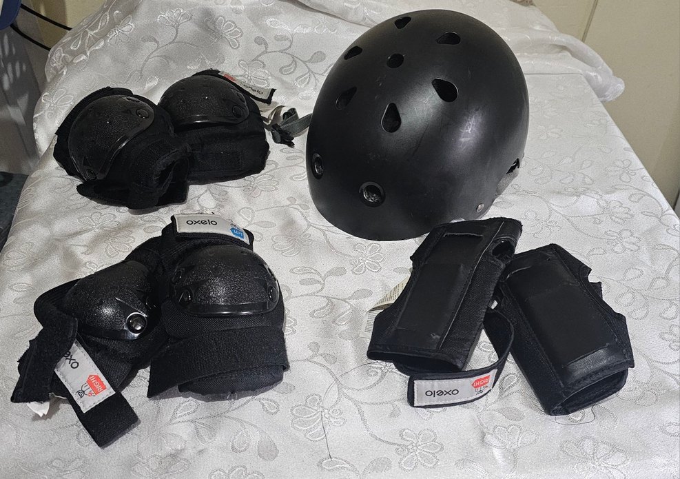 Siyah biker dizlik ve koruyucu seti, Velcro bantlı, desenli ve dayanıklı plastik malzemeden yapılmıştır. Kask da dahildir. ️