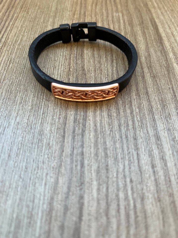 Siyah deri bant ve koyu işlemeli metal plaka detayıyla minimalist biker tarzı erkek bileklik.