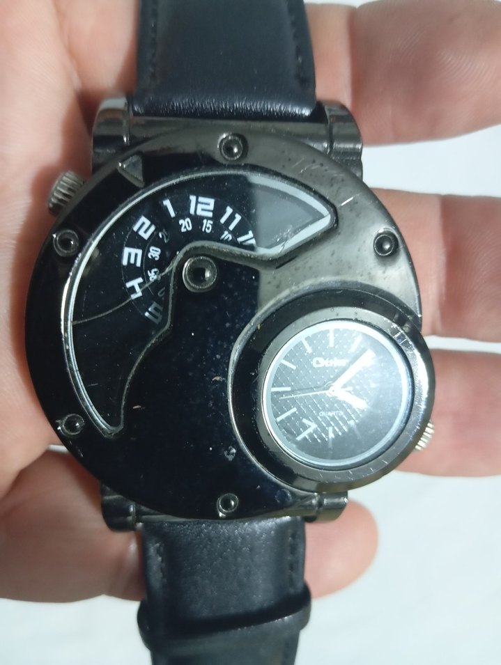 camın üzerine küçük çizik var iki tane saat pili yeni takıldı Koyu siyah renkte, biker tarzı erkek saati. Grunge punk havası olan, farklı kadran tasarımlı ve "2015, 12, T" yazılı detaylar içerir.