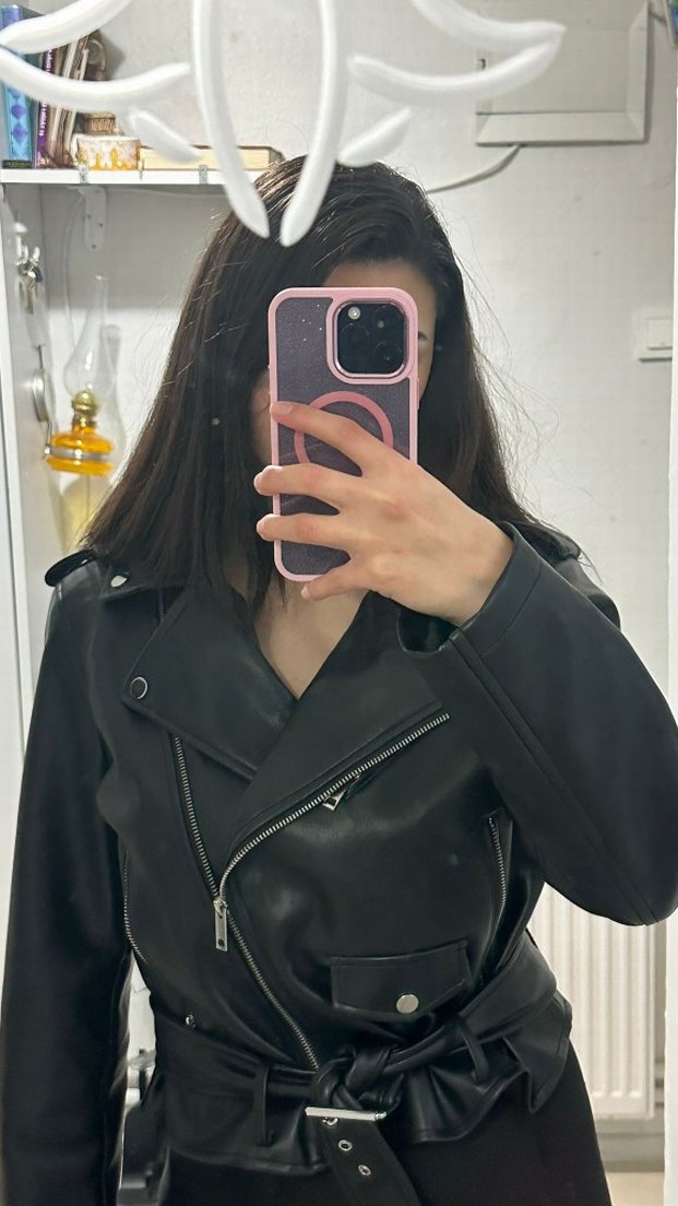 Siyah, fitted biker tarzı deri ceket, yakasında kesimli yaka ve tokalı detaylar bulunur. Askılı kollu ve normal midi boyda, rock punk tarzına uygun.