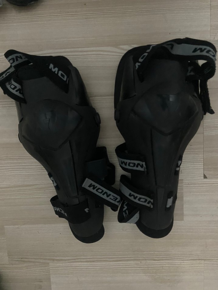 Siyah renkli, kauçuk malzemeden yapılmış, Velcro bantlı biker motosiklet dizlikleri. Desensiz tasarım ve 'WON' yazılı bantlar içerir. ️