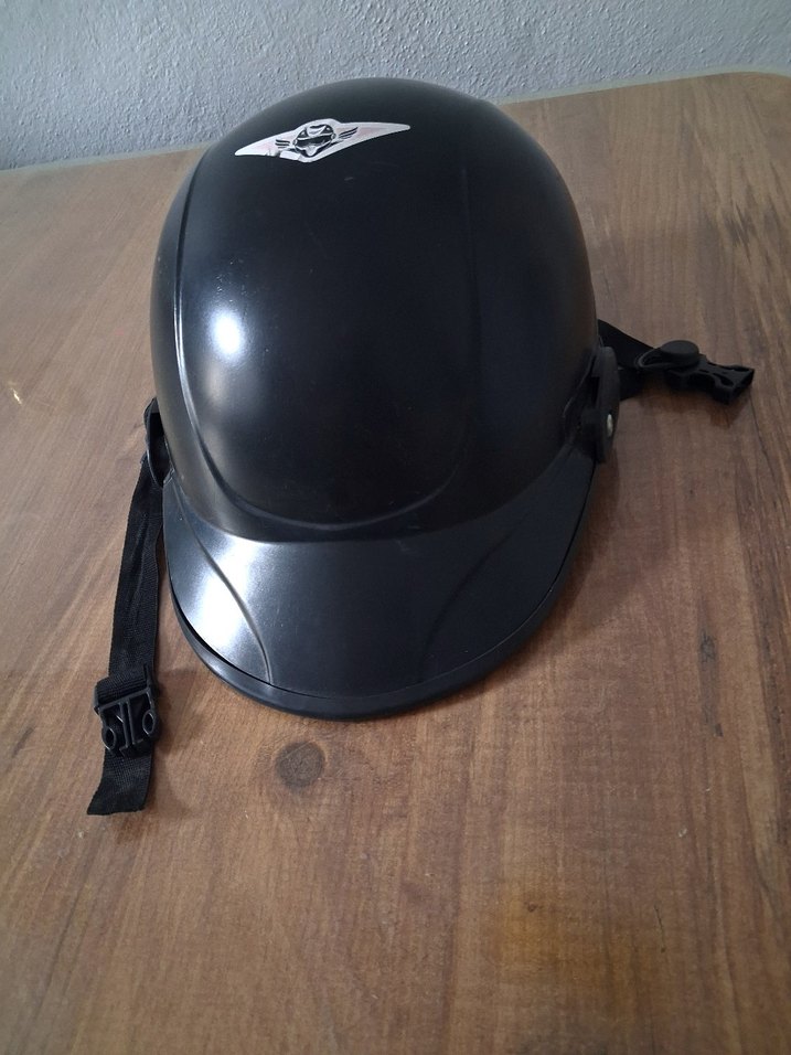 Siyah plastikten yapılmış, tokalı kayışa sahip, rock punk havasına uygun sade tasarımlı biker motosiklet kaskı. ️