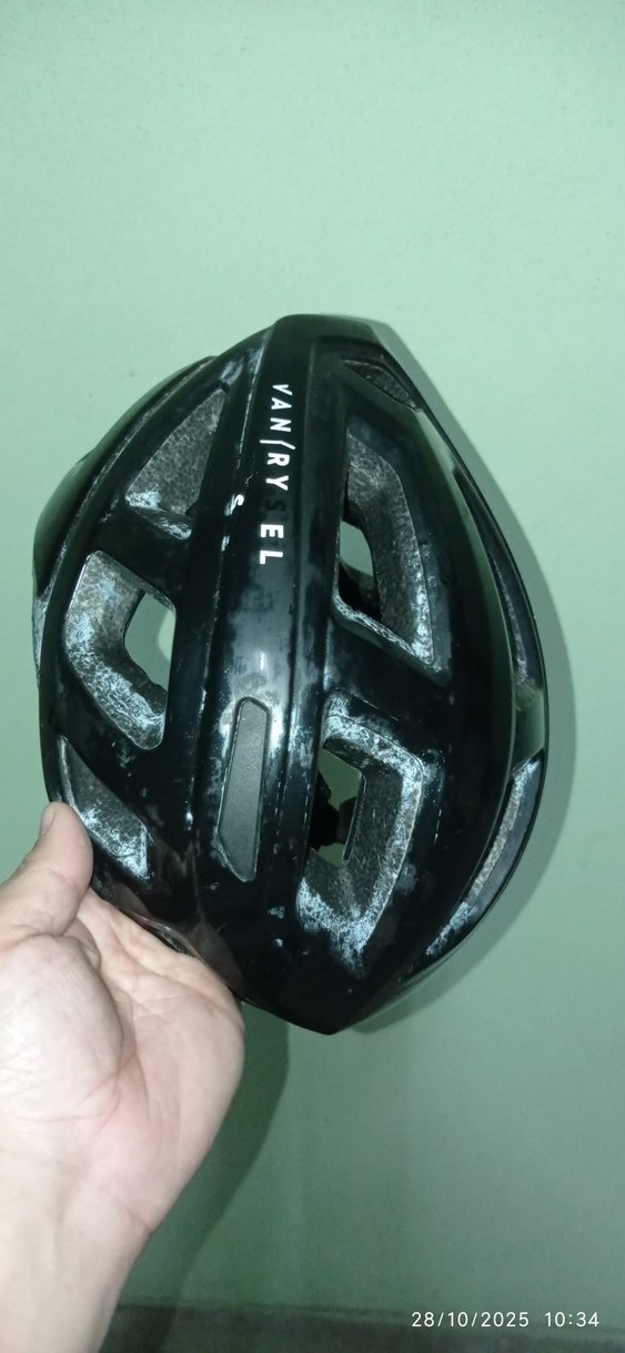 Siyah plastikten yapılmış, Velcro kayışlı biker tarzı Bisiklet kaskı. Koyu renkte ve desensiz, üzerinde "VANYRY" yazısı bulunur. ️
