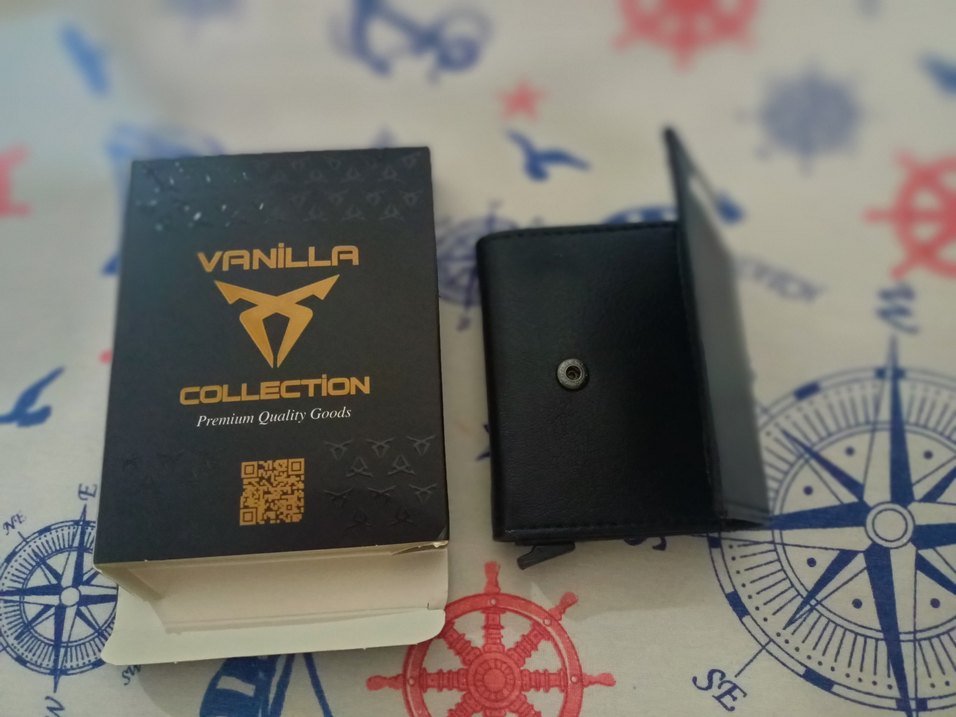 Düğmeli kapaklı, baskılı detaylara sahip siyah biker tarzı erkek cüzdan. Vanilla Collection ambalajıyla birlikte.