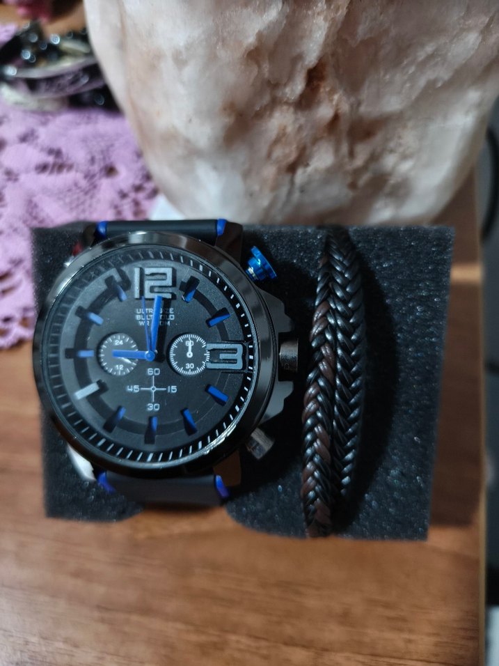 Siyah biker tarzı erkek kol saati, koyu kadran ve mavi detaylarla birlikte örgülü bileklik içerir. Sokak stiline uygun. ⌚