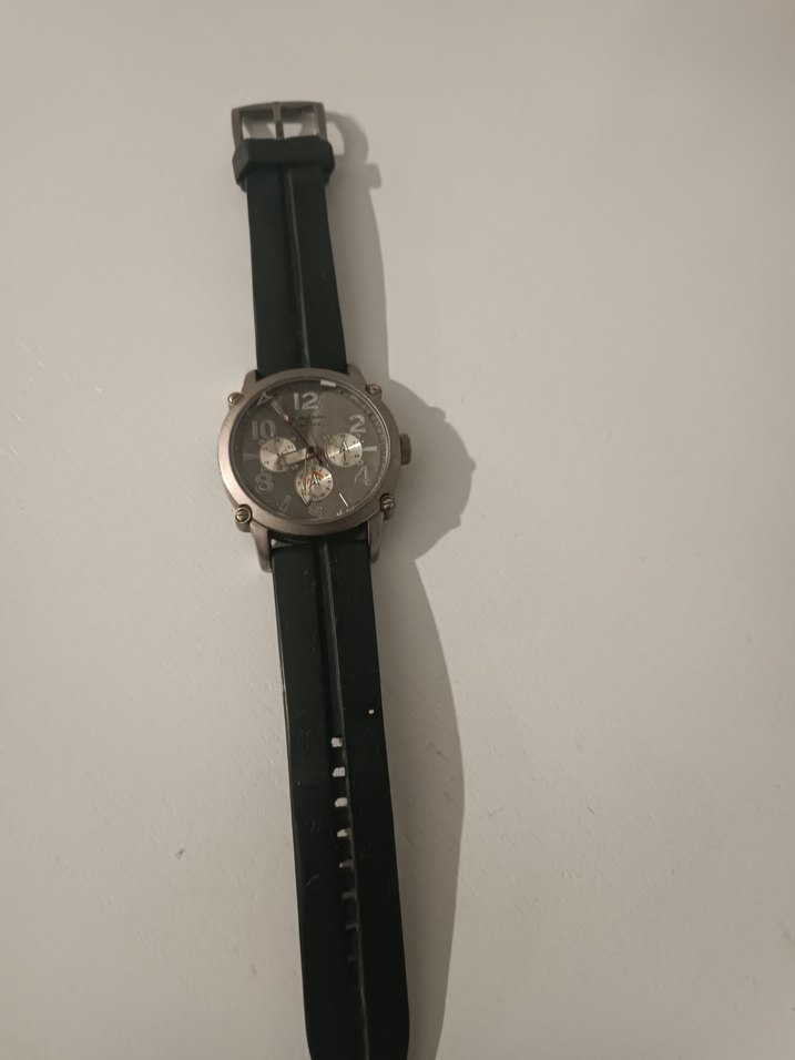 Bu erkek kol saati, çoklu alt kadranlara sahip gri kadranı ve siyah kayışı ile biker sokak stilini yansıtıyor.