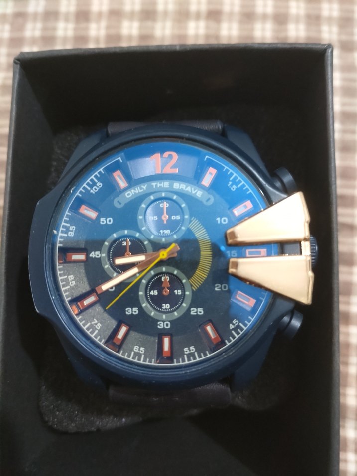 Turuncu detaylı koyu renk siyah biker tarzı erkek kol saati, belirgin rakamlar ve alt kadranlarla sokak stiline uygun. ⌚