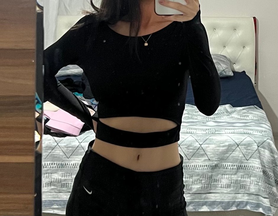 Siyah, bisiklet yaka, uzun kollu ve ipeksi dokulu, vücuda oturan crop top. Cesur goth athleisure tarzına uygun.