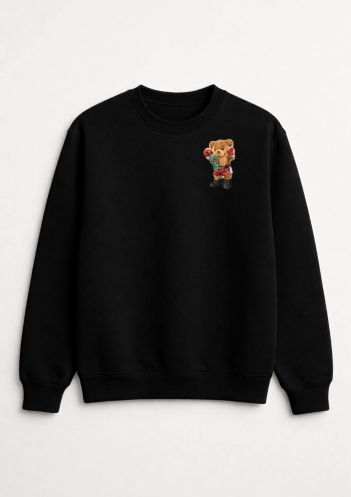 Siyah bisiklet yaka kadın sweatshirt, uzun kollu ve bol kesimdir. Örgü dokusu ve göğüs kısmında baskılı desen bulunur, yumuşak ve sıcak kumaştan üretilmiştir.