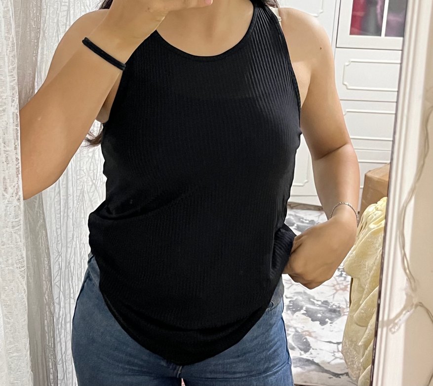 Siyah renkte, yüksek yakalı ve kalın askılı sporcu kadın atlet, yumuşak sentetik kumaştan üretilmiş