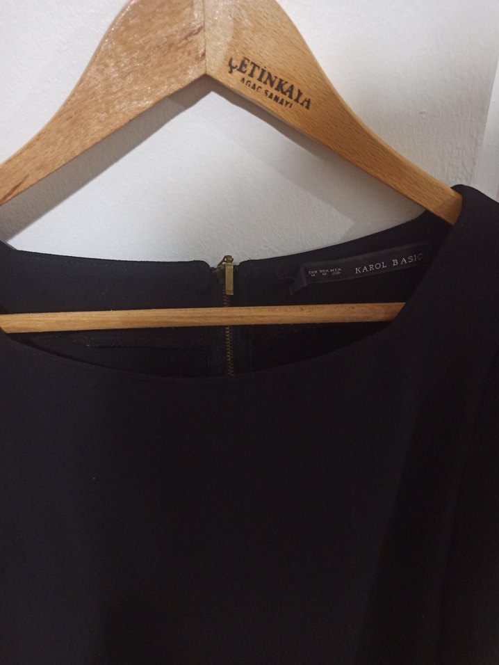 Siyah, bisiklet yakalı, uzun kollu,kısa elbise. İpeksi kumaştan, minimalist ve gotik tarzda, ofis için uygun ve zahmetsiz şıklık sunar.