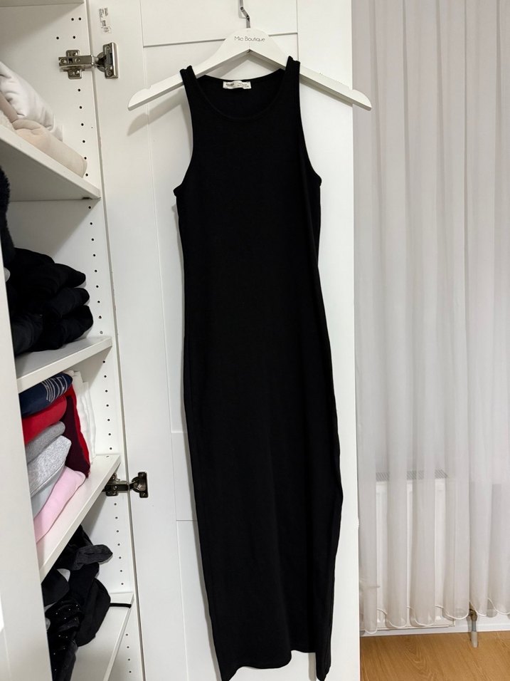 Siyah, kolsuz, uzun elbise, yüksek yakalı ve vücuda oturan kesimiyle minimalist normcore tarzını yansıtır. Günlük kullanıma uygun, rahat ve şık bir model.
