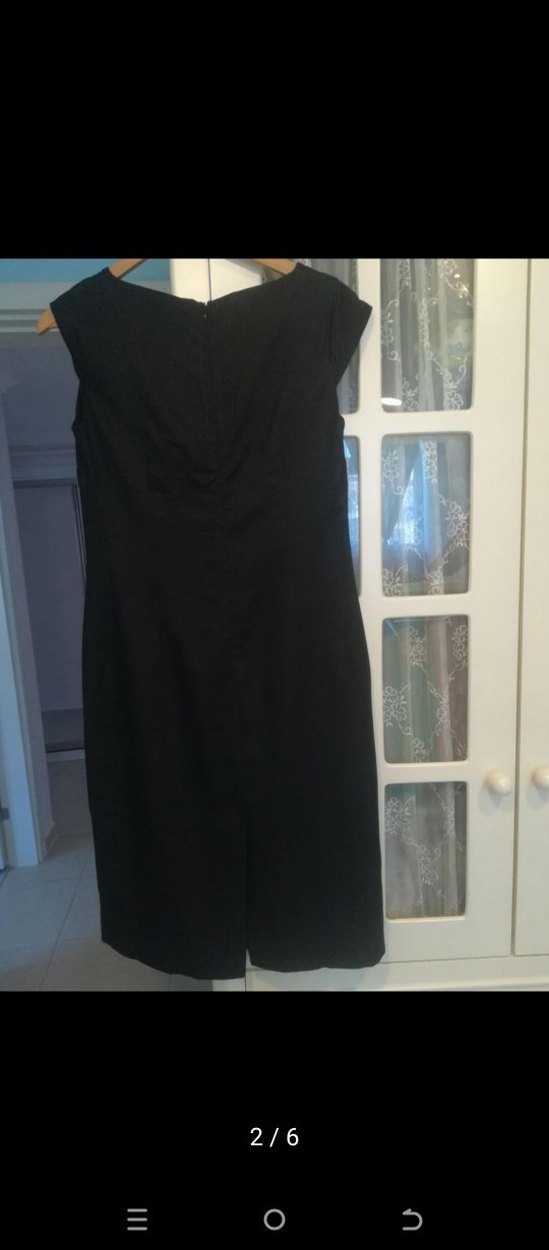 Siyah midi elbise, bisiklet yaka ve kolsuz tasarımıyla, drapeli detaylara sahip. Ofis ve iş ortamları için uygun, rahat kesimli hafif simli şık bir modeldir.