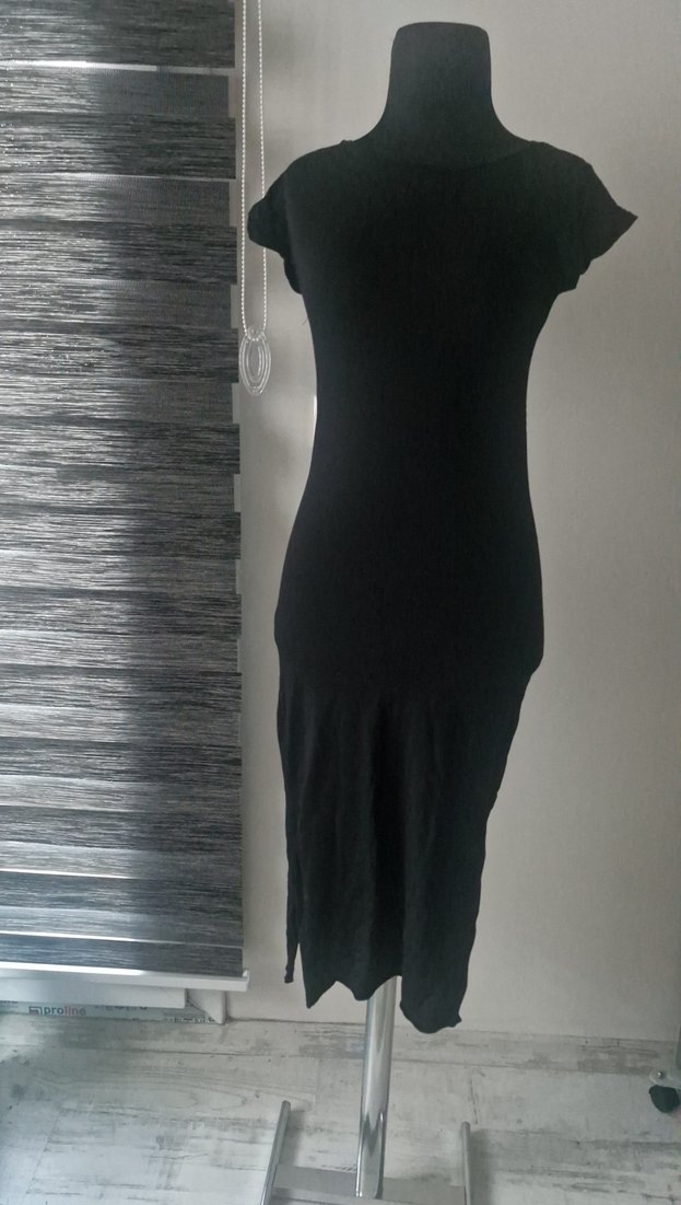 Bisiklet yakalı, yarım kolu ve vücuda oturan siyah uzun elbise. Ambar markalı s beden çift yırtmaçlı elbisedir. Çok az giyildi.
