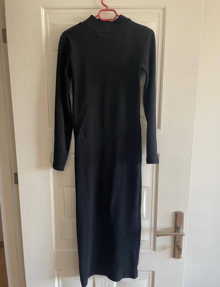 Siyah, bisiklet yakalı ve uzun kollu, vücuda oturan yırtmaçlı bu uzun elbise,midi boydur bi kaç defa giyildi herhangi bir sorunu yok