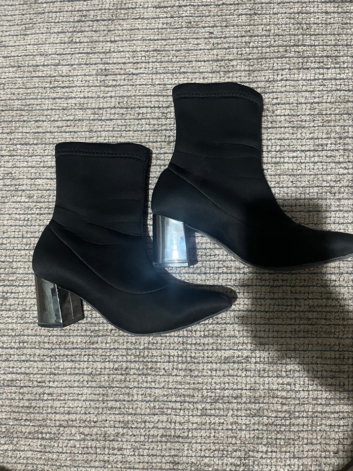 Siyah elastik üst kısmı ve blok topuklarıyla kadın botu, ofis kullanımı için şık ve çağdaş tasarıma sahip. Düz ve desensiz yüzey, şeffaf topuk detayı bulunur.