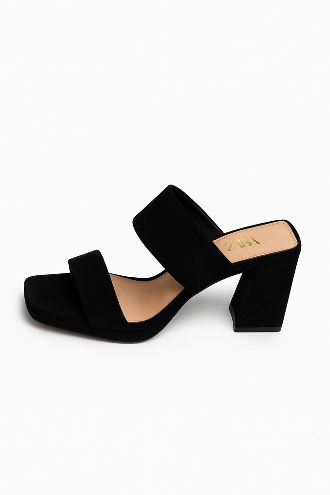 Siyah platform topuklu kadın terlik, blok topuk ve tokalı kayışlara sahip. Minimalist tarzda, yılan desenli ve kauçuk malzemeden, romantik akşamlar için uygun.