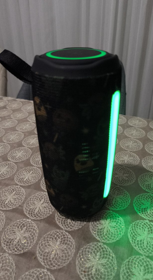 LED ışıklı, taşınabilir siyah Bluetooth hoparlör. Kolay taşınması için askısı bulunur. Kablosuz ses oynatma sağlar. Sıfır ürün