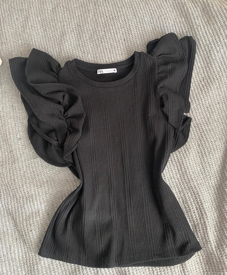 Fitted kesim, yuvarlak yakalı siyah keten bluz, kısa kollarda fırfır detaylarıyla trendy ve rahat bir görünüm sunar. Günlük kullanıma uygundur.