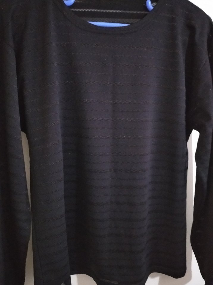 Siyah renkte, uzun kollu ve yuvarlak yakalı kadın bluzu. Yumuşak sentetik kumaştan üretilmiş, piliseli dokusu ve bol kesimi vardır. Günlük kullanıma uygundur.
