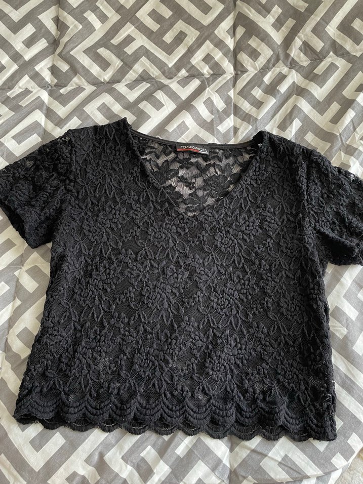 Siyah dantel detaylı, V yaka ve kısa kollu bluz. S beden