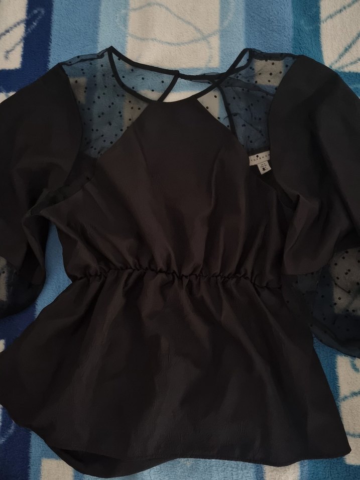 Uzun kollu, V yakalı siyah bluz, omuzlarda tül ve puantiye detaylı, bol kesim ve fırfırlı. Gotik tarz için uygun.