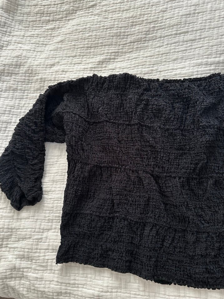 Hiç kullanılmadı, kayık yaka büzgülü siyah bluz