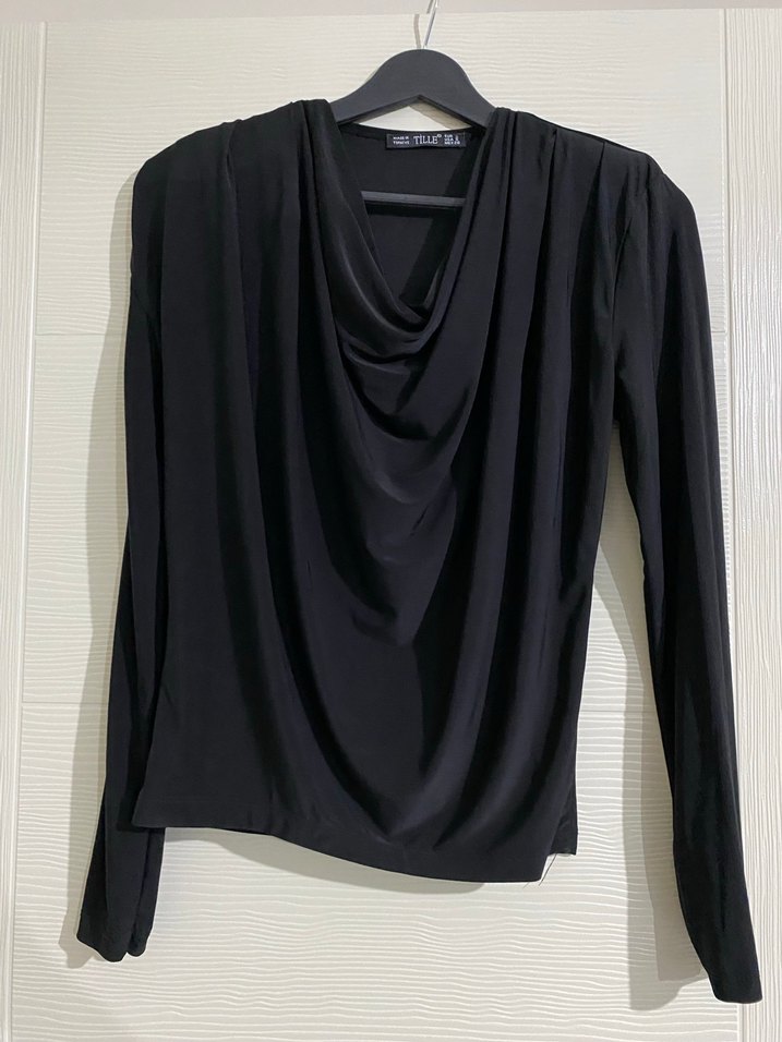 Siyah, kolları vatkalı önü dökümlü penye esnek kumaş bluz çok fazla giyilmedi.