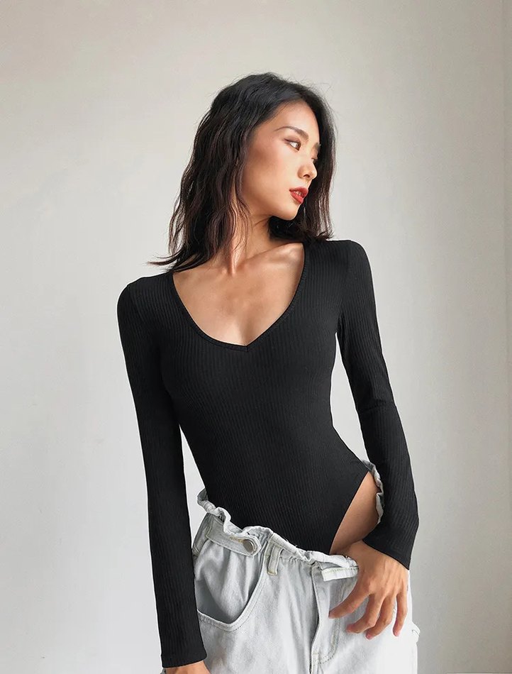 Siyah v yakalı uzun kollu ve vücuda oturan bodysuit S beden mevcuttur