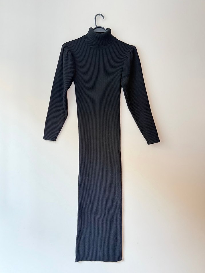 Siyah Boğazlı Fitilli Uzun Triko Elbise