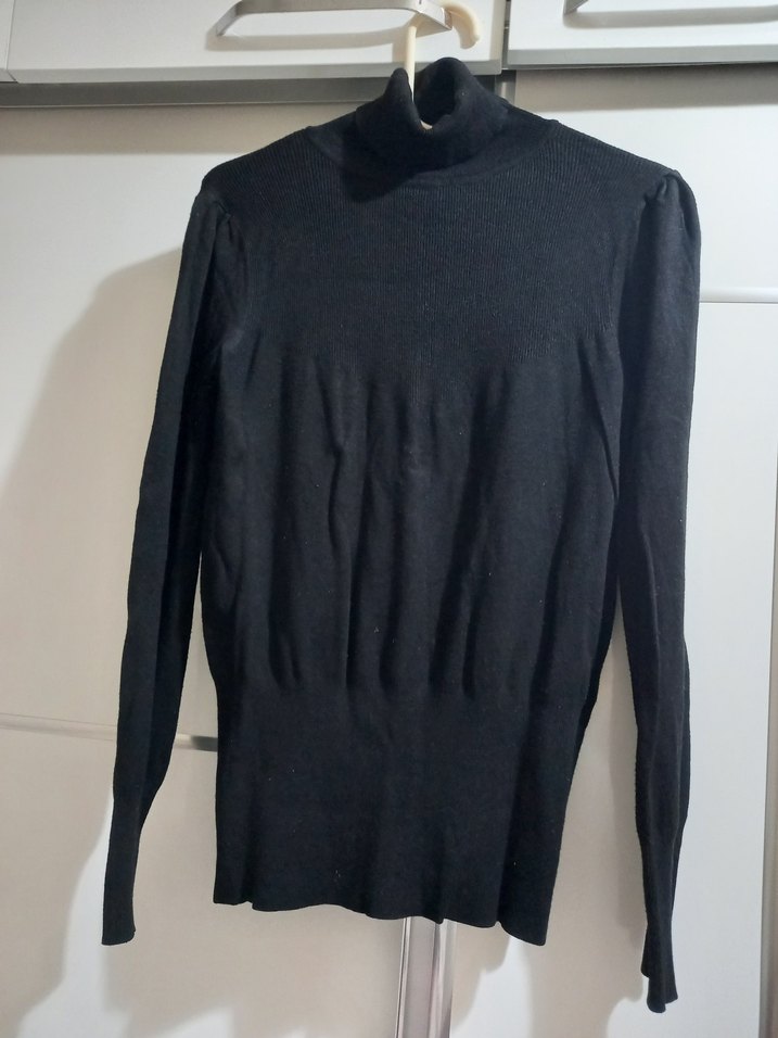 Siyah, boğazlı ve uzun kollu kadın kazak. İnce örgü, yumuşak yün kumaştan, minimal goth tarzında tasarlanmıştır. Günlük kullanıma uygundur.