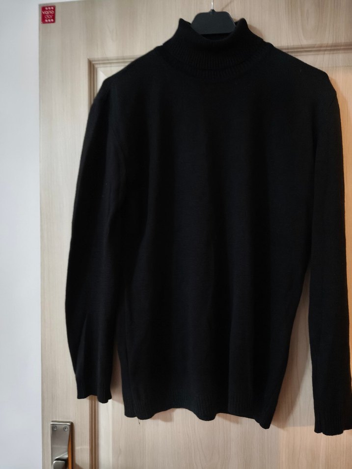 Yumuşak ve sıcak kumaştan yapılmış, boğazlı ve uzun kollu, siyah ince ve dar kesim kazak. Günlük sokak stiline uygun, sade ve şık görünüm.