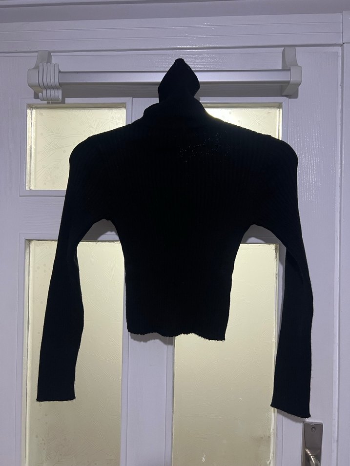 Siyah boğazlı, uzun kollu ve vücuda oturan bu kazak yumuşak yün kumaştan örülmüştür. Minimalist goth tarzda, günlük kullanıma uygundur.