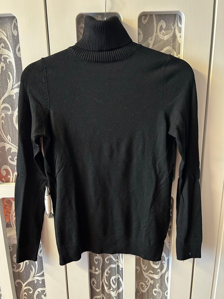 Siyah, boğazlı ve uzun kollu bu fitted yün kazak, triko örme dokusuyla rahat ve gotik bir stil sunar. Normal boyu günlük kullanım için uygundur.