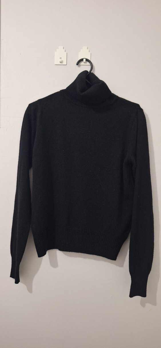 Siyah boğazlı, uzun kollu kadın triko kazak, yumuşak yün kumaştan, rahat ve şık, günlük kullanıma uygun.