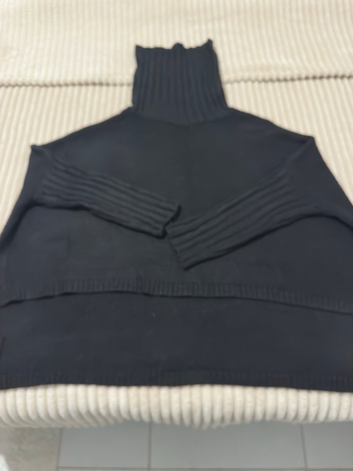 Siyah, boğazlı, örgü kumaştan yapılmış, uzun kollu ve normal boyda, rahat ve şık kadın kazak. Günlük kullanıma uygundur.