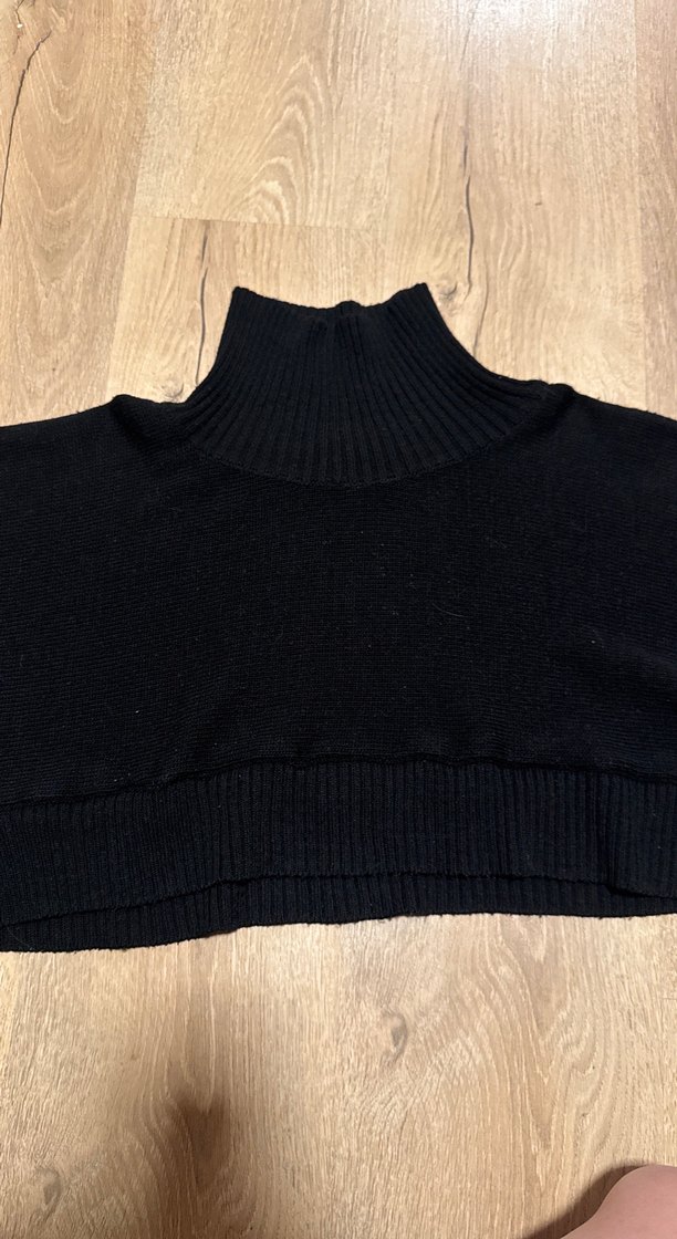Siyah yün kumaştan, boğazlı ve uzun kollu örgü kadın crop kazak. Rahat kesimi ve normal boyu ile günlük kullanıma uygun.