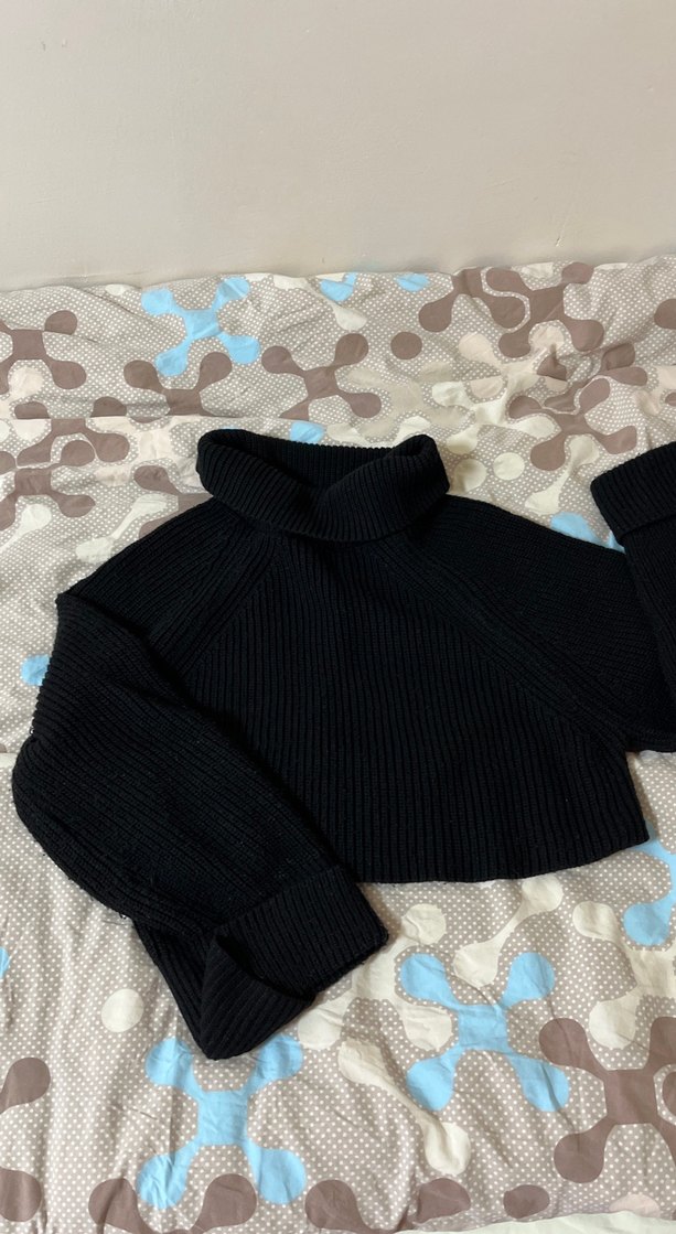 Siyah renkli, boğazlı ve uzun kollu örgü kazak, rahat kesimiyle günlük kullanım için uygundur.