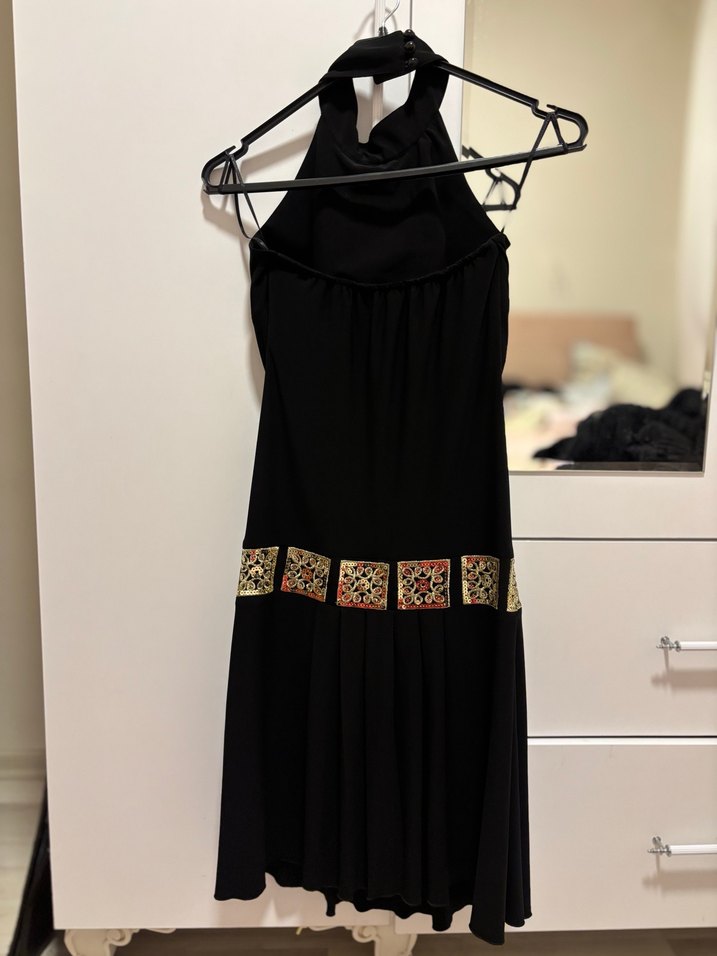 Kısa siyah kadın elbise, kemerli ve baskılı detaylıdır. Fit kesim ve boğazlı sırtı açık ,romantik akşamlar için uygundur.